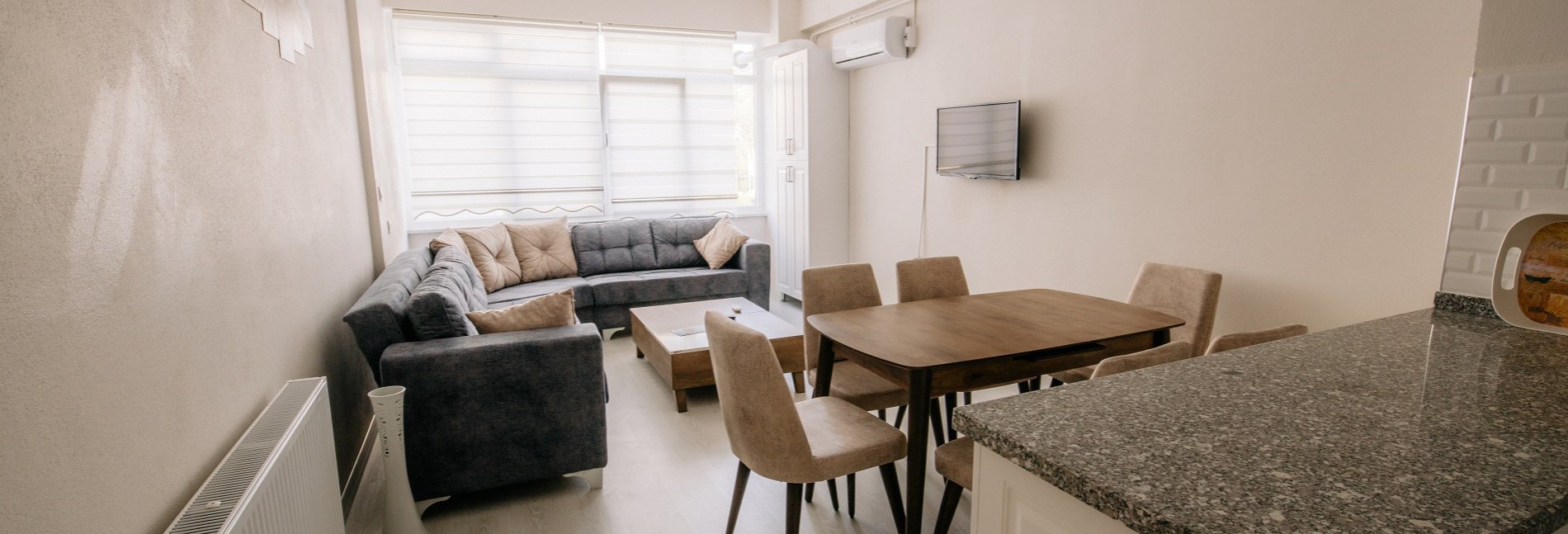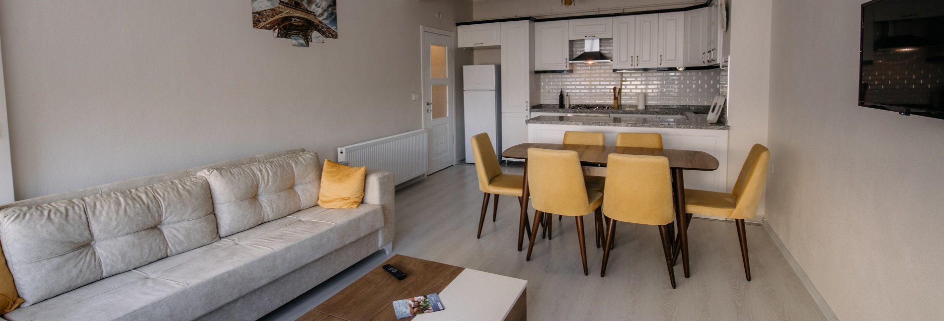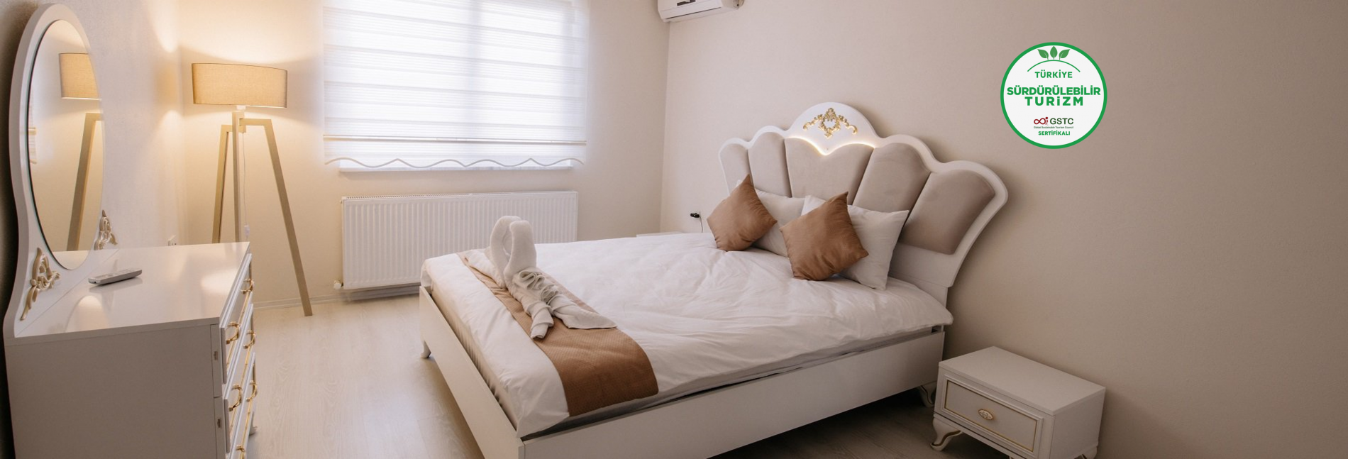 Dairelerimiz iki yatak odası, banyo, salon ve amerikan mutfak şeklindedir.Evlerde her iki yatak odasında ve salonda klima bulunmaktadır.Banyolarda banyo havlusu ve el havlusu ,şampuan, saç kremi , duş jeli, sabun ile fön makinesi bulunmaktadır. Her iki yatak odasında gardırop ve askı mevcuttur. Evlerde LCD TV, buzdolabı, ankastre ocak & fırın, davlumbaz, su ısıtıcısı vardır.Mutfakta yemek takımı, çatal/kaşık takımı, çay takımı,... » detaylar