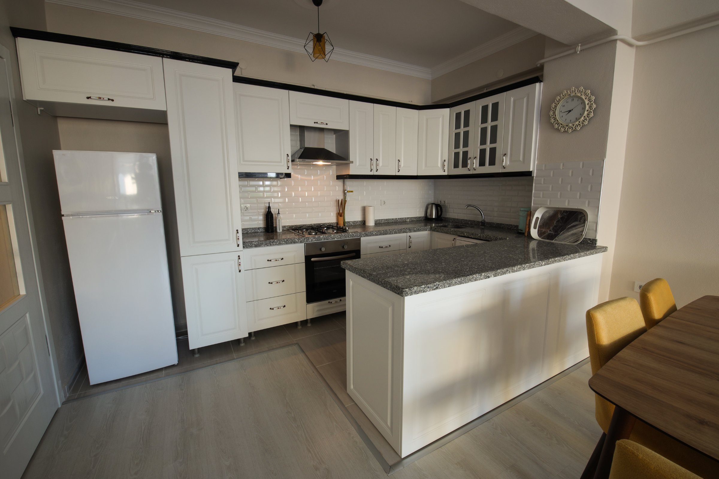 Mutfakta yemek takımı, çatal/kaşık takımı, çay takımı, meşrubat bardağı, ve su bardağı ile temel mutfak eşyalarından bulaşıklık, servis tepsisi, yağ tavası, derin tencere, cezve, rende, kevgir, süzgeç, kepçe, servis kaşığı, tahta kaşık, tirbuşon, tuzluk/karabiberlik, cam salata kasesi, küçük ve büyük boy cam servis tabakları bulunmaktadır.